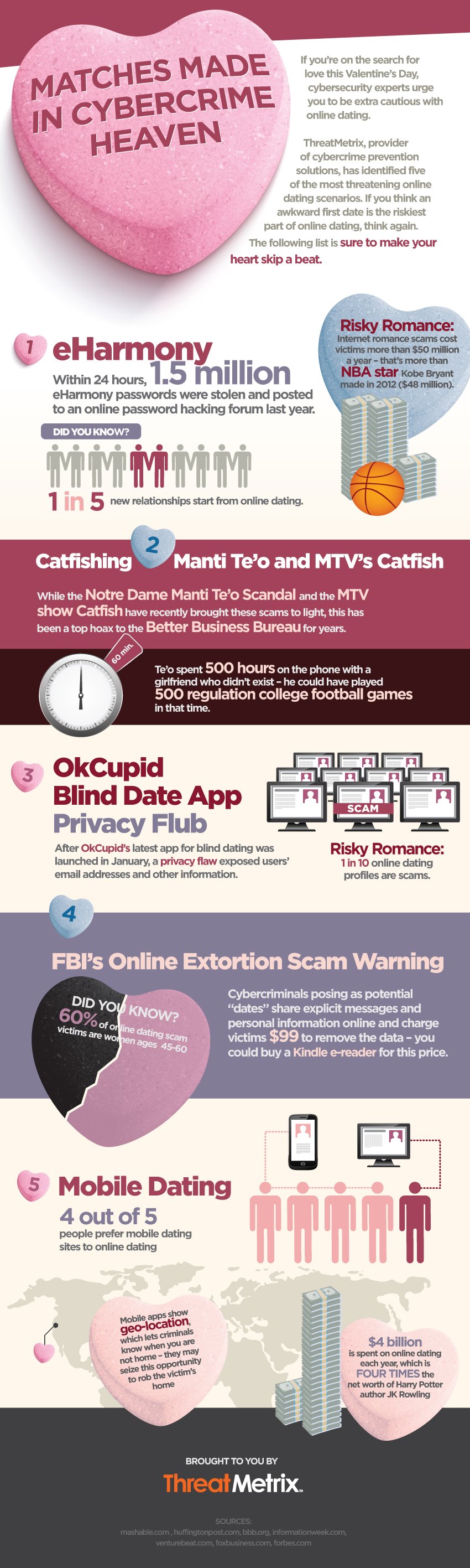Check out this infographic from ThreatMetrix that illustrates how widespread online dating scams have become. Here are just a few facts and figures you should know: